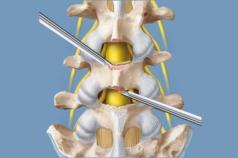 Blick von hinten auf den Spinalkanal bei einem operativen Eingriff durch Dekompression mithilfe spezieller Instrumente (z. B. Knochenstanzen).