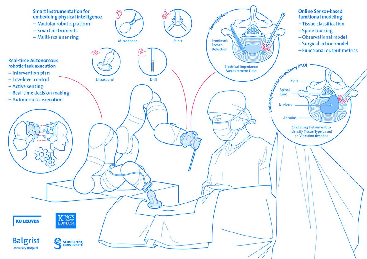 The international research project foresees the following key elements: non-visual sensors that form a multifaceted representation of the surgical task; functional models that relate signals to functional parameters and controllers, that produce sensible autonomous robot actions optimizing functional performance. This new concept will be showcased and validated on complex spine surgeries.
